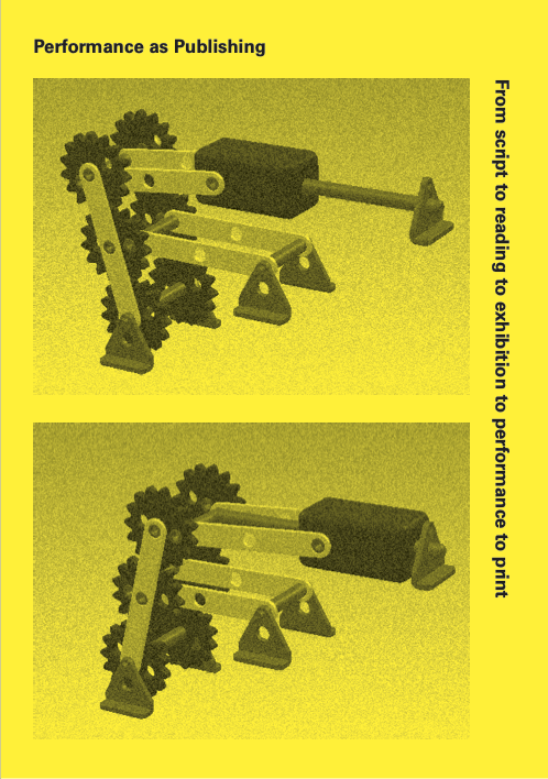 This publication formed one static point in the loosely circular movement of From script to reading to exhibition to performance to print. The contributions exemplify the way artists use text as both material and tool, validating all points as both process and endpoint, proposal and realisation.