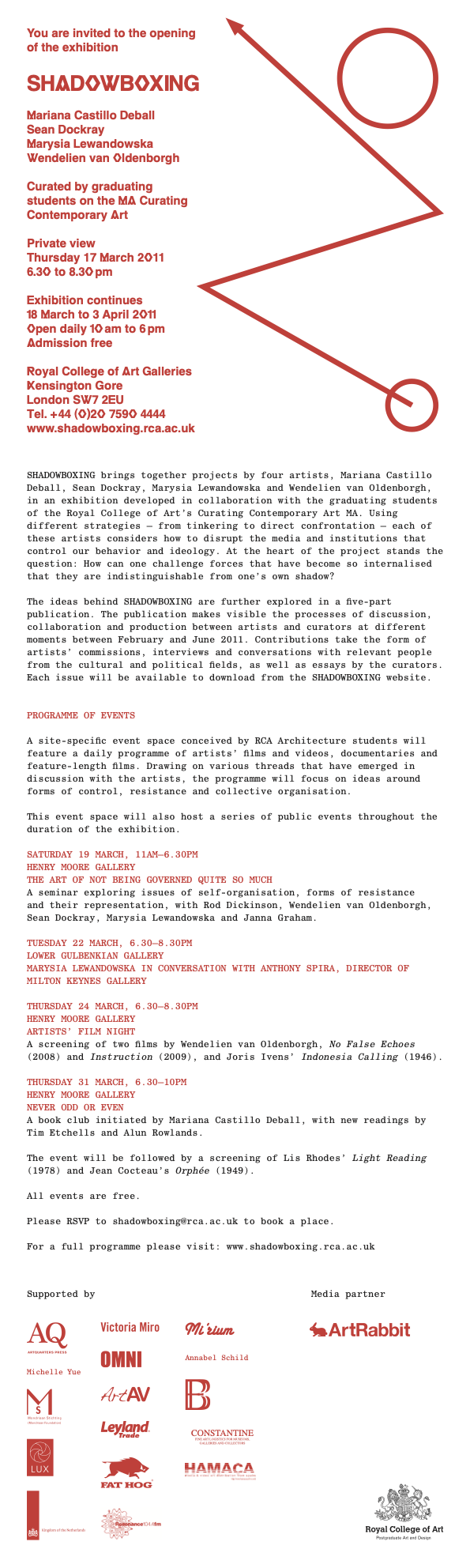 As part of ‘Shadowboxing’, curated by Vanessa Boni et al, MA Curating Contemporary Art, Royal College of Art, 2011