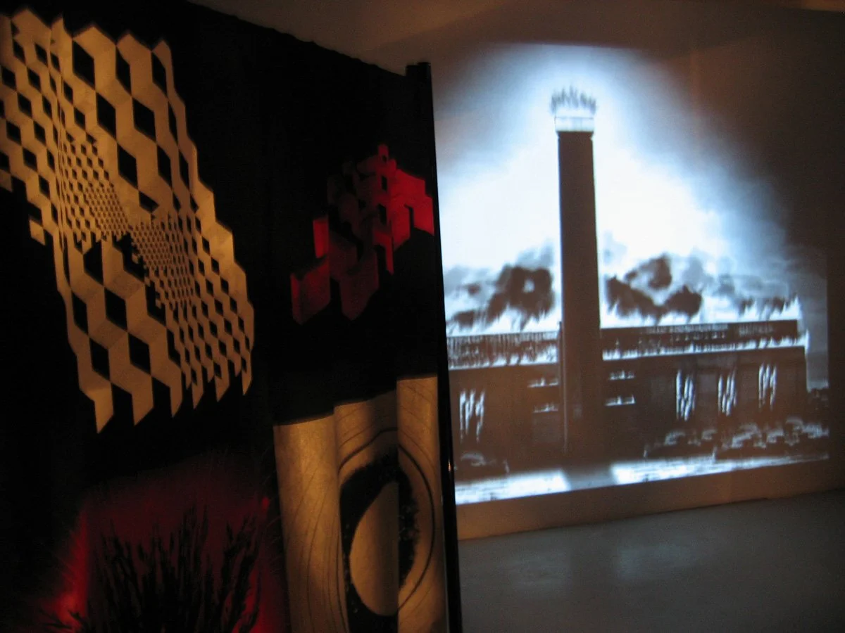 Mark Titchner’s installation When we build let us think that we build forever (2005), first made manifest at Vilma Gold Project Space, Berlin, and reconfigured at Arnolfini, Bristol, is a multifaceted mise-en-scéne. Here, the allegory of the cave is deconstructed through image, object and text. Projections replace the fire, sculptures replace the forms casting shadows, screens replace the cave wall and the echoes become a distorted, hypnotic soundtrack. This illusory space is staged. It vibrates and resonates in semidarkness. Our senses are assaulted with a totalising affect. To block in the scenario - a freeze frame, a snapshot - there is a central totemic black pyramid. It shimmers in projected light that illuminates inscribed text. Dense fabric screens, punctuated by lamps that act as strange attractors, encircle the periphery of the space. A rebus of disconnected images adorns the screens, impressing upon us the swift and continuous shift of external and internal stimuli. The drone of peripheral sound and the flicker of images amplify the antagonistic undertow of the structures. Events are not what they seem. A confounding multiplicity of voices vies for our attention through the very fabric and materiality of the installation.