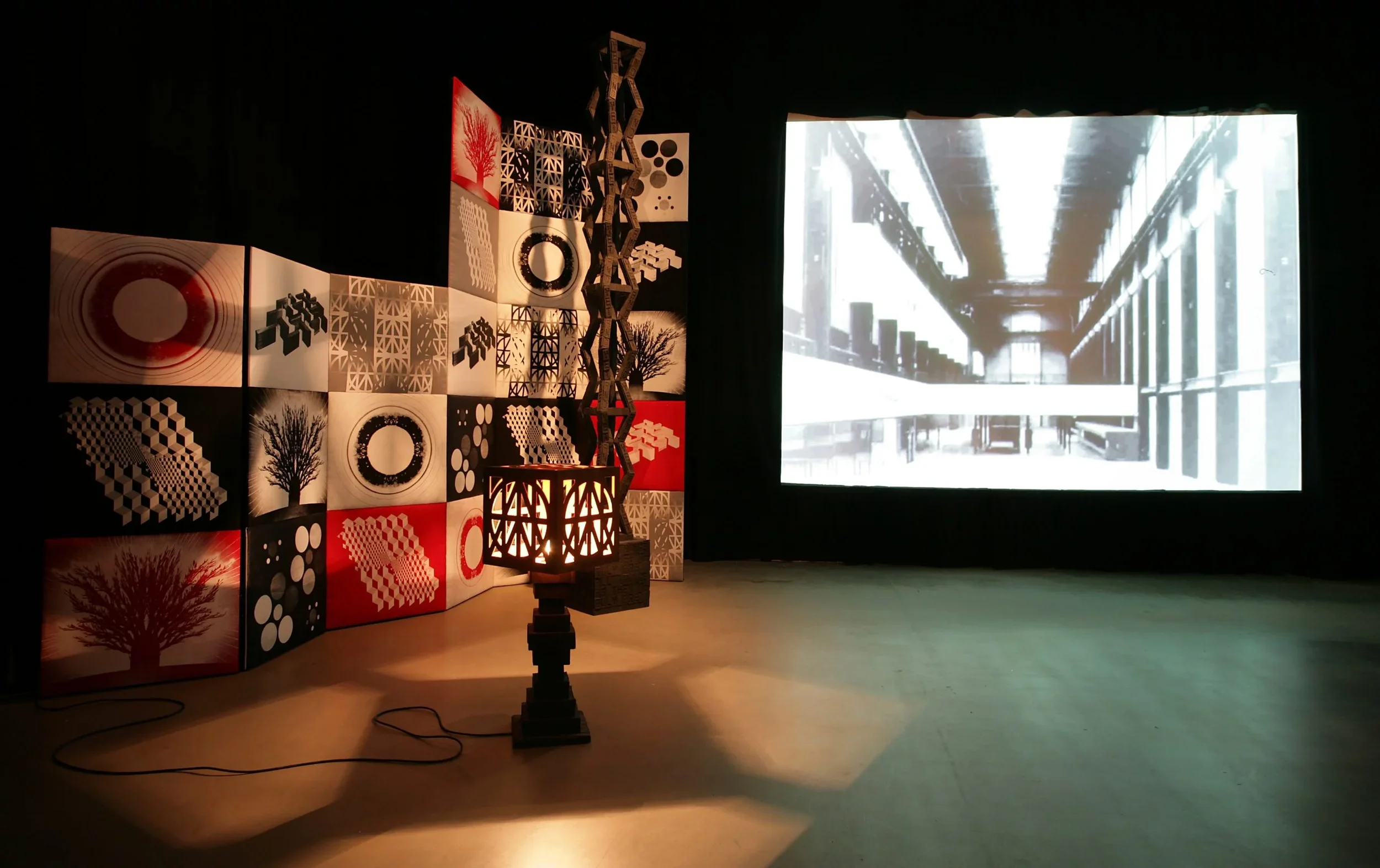 This essay reads Mark Titchner’s When We Build Let Us Think That We Build Forever through Plato’s allegory of the cave in a dark, seductive mise-en-scène that assaults the senses and confounds questions of truth. What happens when modernism’s utopian ideals are cannibalized and repurposed? How do institutions wield images and language to forge control over history and truth? Titchner’s installation stages illusion through fractured layers of projection, sculptural totems, and disjointed narratives. It is a theatre of fragmented perception where knowledge, power, and cultural mythologies collide. The text cuts through the fabric of references to reveal method, as a collage of distorted citations — from avant-garde psychotechnic torture cells to Philip K. Dick’s gnostic visions. Here cinematic flicker, cryptic sigils, and sonic mantras manipulate unconscious desire, questioning how representation shapes reality and dissent. The analysis refuses straightforward exegesis, embracing multiplicity to reflect the installation’s politics of knowledge, in a flickering film of cultural power, where art becomes a site of radical speculation and political provocation.